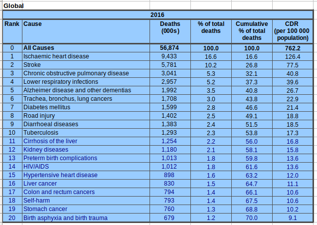 EDIT: wenn ich das jetzt richtig gesehen habe fehlen im Balkendiagramm auch noch ein paar relevante Kategorien wie z.B. Schlaganfall (stroke) und Koronare Herzkrankheit (ischaemic heart disease). Laut WHO sind zumindest im Jahr 2016 mit 5.8 (Schlaganfall, 10.2%) bzw. 9.4 Mio (16.6%) doch ein beträchtlicher Teil der Toten weltweit auf diese 2 Kategorien entfallen.