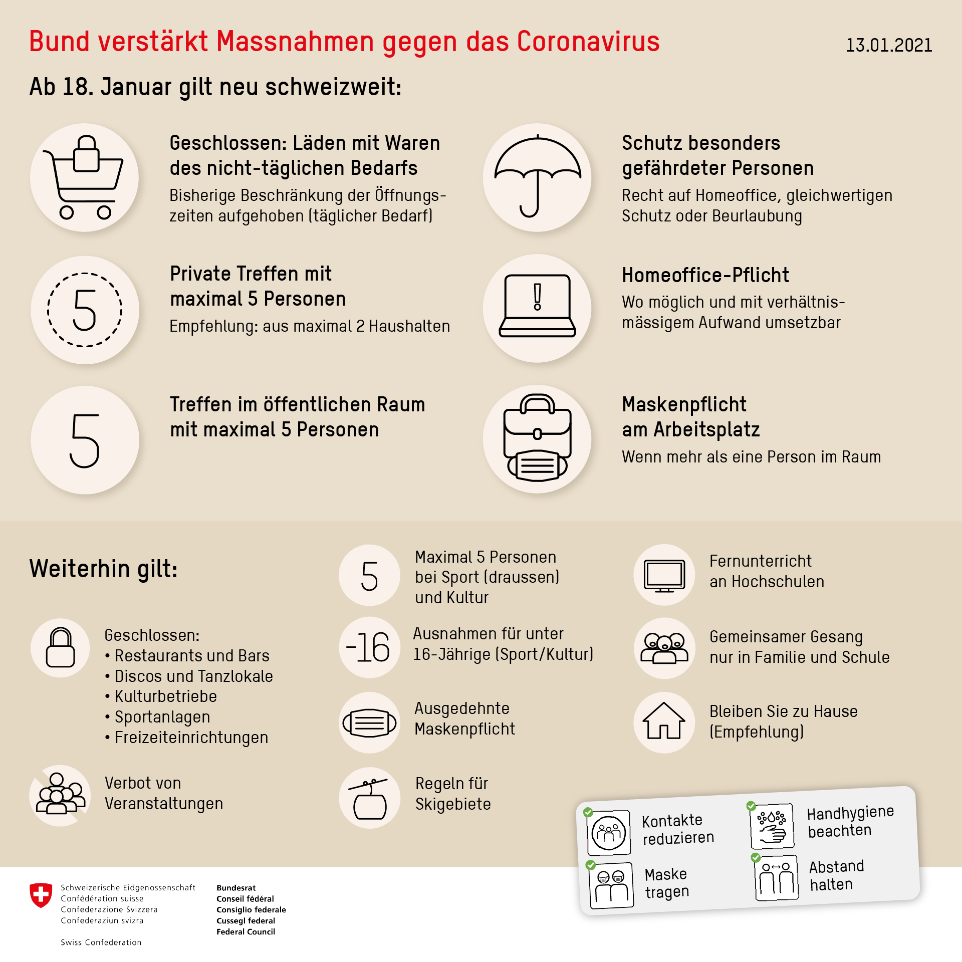 Und warum hat der Bund dann all die in der Grafik gezeigten Verschärfungen ab dem 18.1. in der ganzen Schweiz eingeführt? Wenn die Infektionszahlen, wie Du insinuiest, eh von selbst ("die zaubern sicher") bzw mit weniger einschneidenden Maßnahmen als in Österreich gesunken sind.