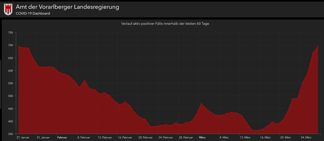 Seit 15.3., also seit morgen vor zwei Wochen gibt es "Lockerungen" (Gasthäuser offen bis 20 Uhr usw) in Vorarlberg wegen der - in Österreich relativ - niedrigen 7-Tages-Inzidenz.