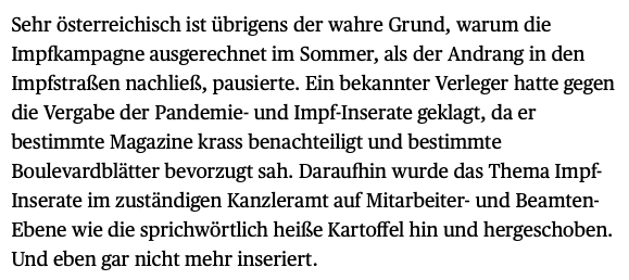 Aus dem "newsletter" von Rainer Novak (Herausgeber und Chefredakteur DIE PRESSE), warum der Bundesmaturant die Pro-Impfen-Kampagne, die er vom ROTEN KREUZ übernommen hat, der Cheffe, im Sommer nicht fortgesetzt hat.