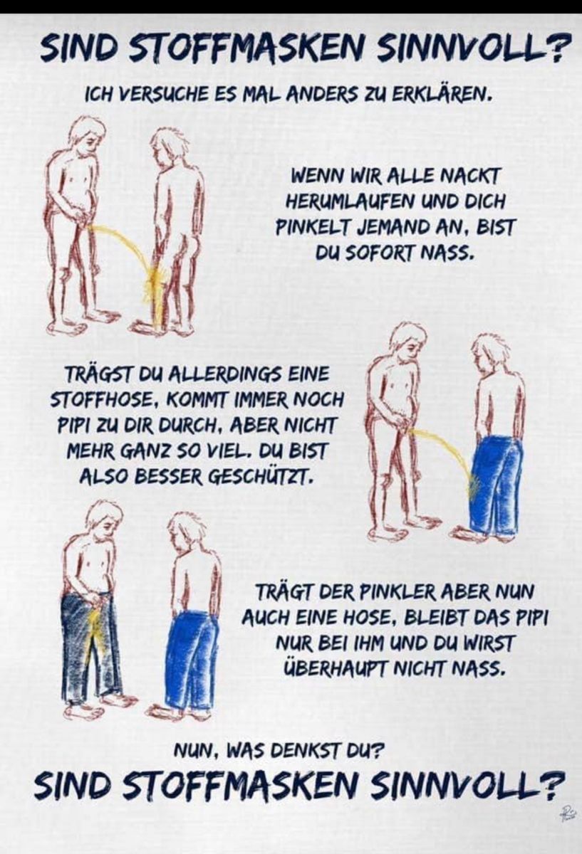 Eigentlich nicht. Der Text impliziert ja, dass wenn ich und mein Gegenüber jeweils eine Hose (Maske) tragen, ich nicht nass (angesteckt) werde. Das mag zwar auf die Hosen zutreffen, bei den Masken ist es aber leider eher nicht so.