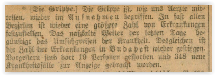 Die Grippe ist, wie uns Ärzte mitteilen, wieder im Aufnehmen begriffen. In fast allen Bezirken ist wieder eine größere Zahl von Erkrankungen festzustellen. Das naßkalte Wetter der letzten Tage begünstigt das Umsichgreifen der Krankheit. Desgleichen ist die Zahl der Erkrankungen in Budapest wieder gestiegen. Vorgestern sind dort l9 Personen gestorben und 348 neue Krankheitsfälle zur Anzeige gebracht worden.