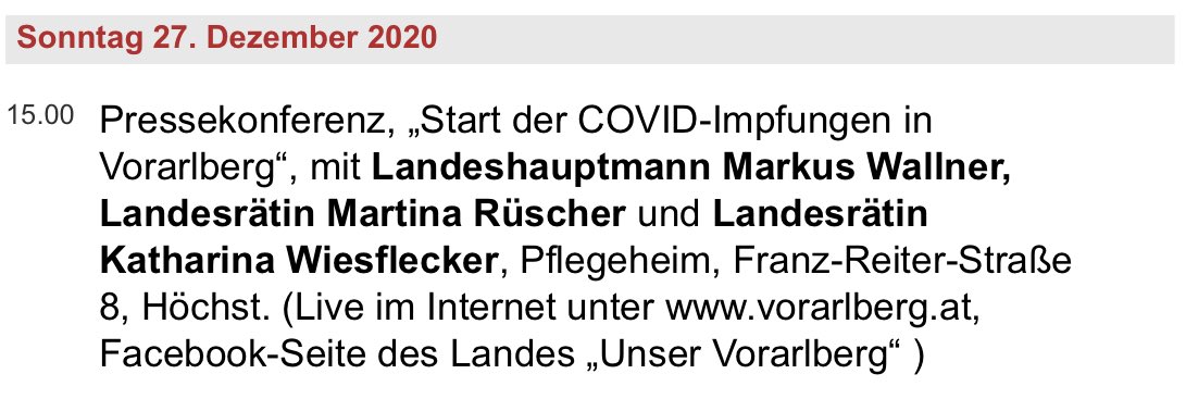 "Impfstoff für die Kamera" twittert der Chefredakteur der "Vorarlberger Nachrichten" Riedmann. Weiter: "Vorarlberg hätte diese Woche per Heli fünf (!) Impfdosen erhalten sollen, sagt aber dankend Nein zu der geplanten Polit-PR-Aktion. Gesundheitslandesrätin will ab Jänner impfen, wenn genügend Impfstoff vorhanden ist."