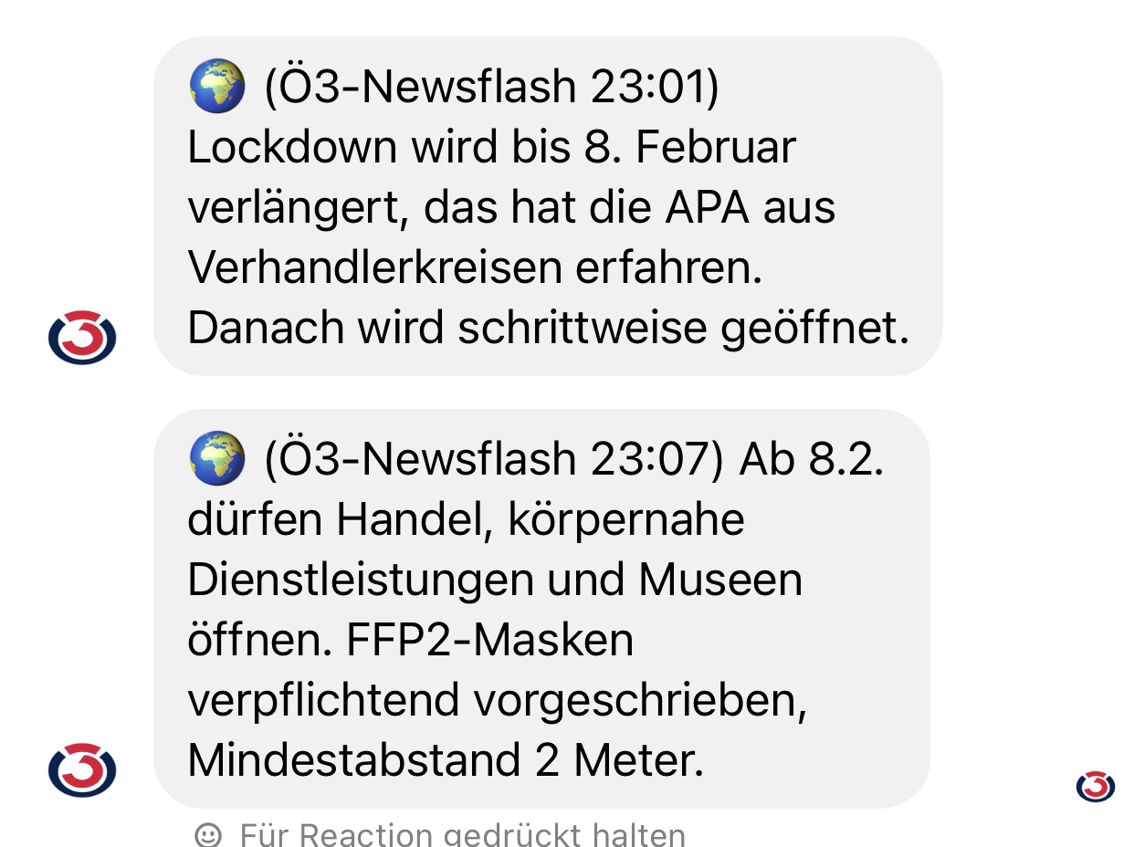 Bezüglich Ferien: warum gehts nicht, dass die Kinder Österreicherin in der ersten feber-Woche in die Ferien gehen. Es ist eh lockdown, vor den Urlauberströmen braucht man sich also nicht fürchten und nach den Ferien Sperr Ma wieder auf. 8)
