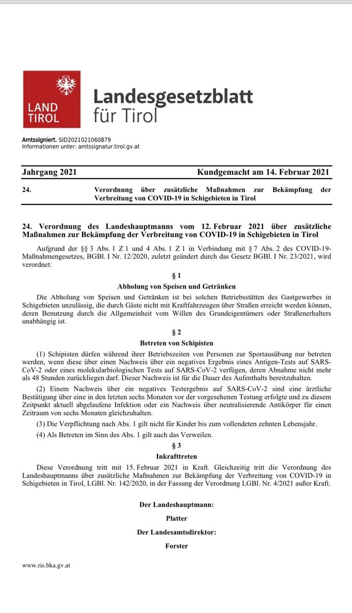Zur Abwendung massiver epidemiologischer Maßnahmen wie Quarantänen durch den Bund hat das Land Tirol vor einer Woche ein mehrere Punkte umfassendes "Maßnahmenpaket" angekündigt. Unter anderem sollte die Beförderung mit einer Aufstiegshilfe (zB Gondelbahn) nur dann erlaubt sein, wenn der Wintersportler - wie beim Besuch eines Friseurs - die Bescheinigung eines negativen Testergebnisses vorlegt.
