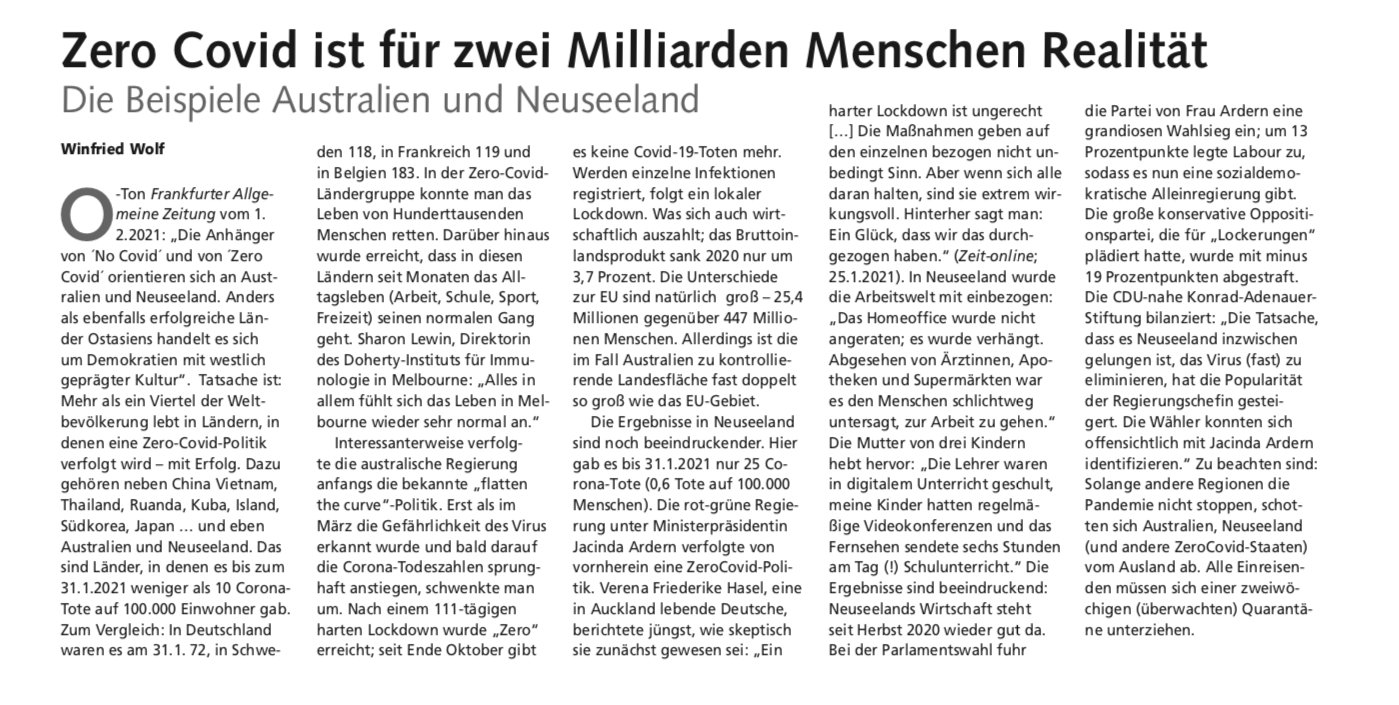 Während bei uns trotz hoher, steigender Infektionszahlen schon wieder einmal die Aufhebung der letzten Einschränkungen (Gastro) des aktuellen Soft-Lockdowns herbeigeredet werden - wohl auch, um von den Regierungstroubles abzulenken (Schramböck-Mahrer-Kaufhaus-Österreich-Bauchfleck, Zerbes-Bericht über das letale Versagen der Terrorismusbekämpfer, Korruptionsverdachts-Hausdurchsuchung bei Finanzminister Blümel, dramatischer Wirtschaftseinbruch im 4. Quartal 2020 usw) -, leben 2 Milliarden mit Zero Covid. Und zwar ganz gut.