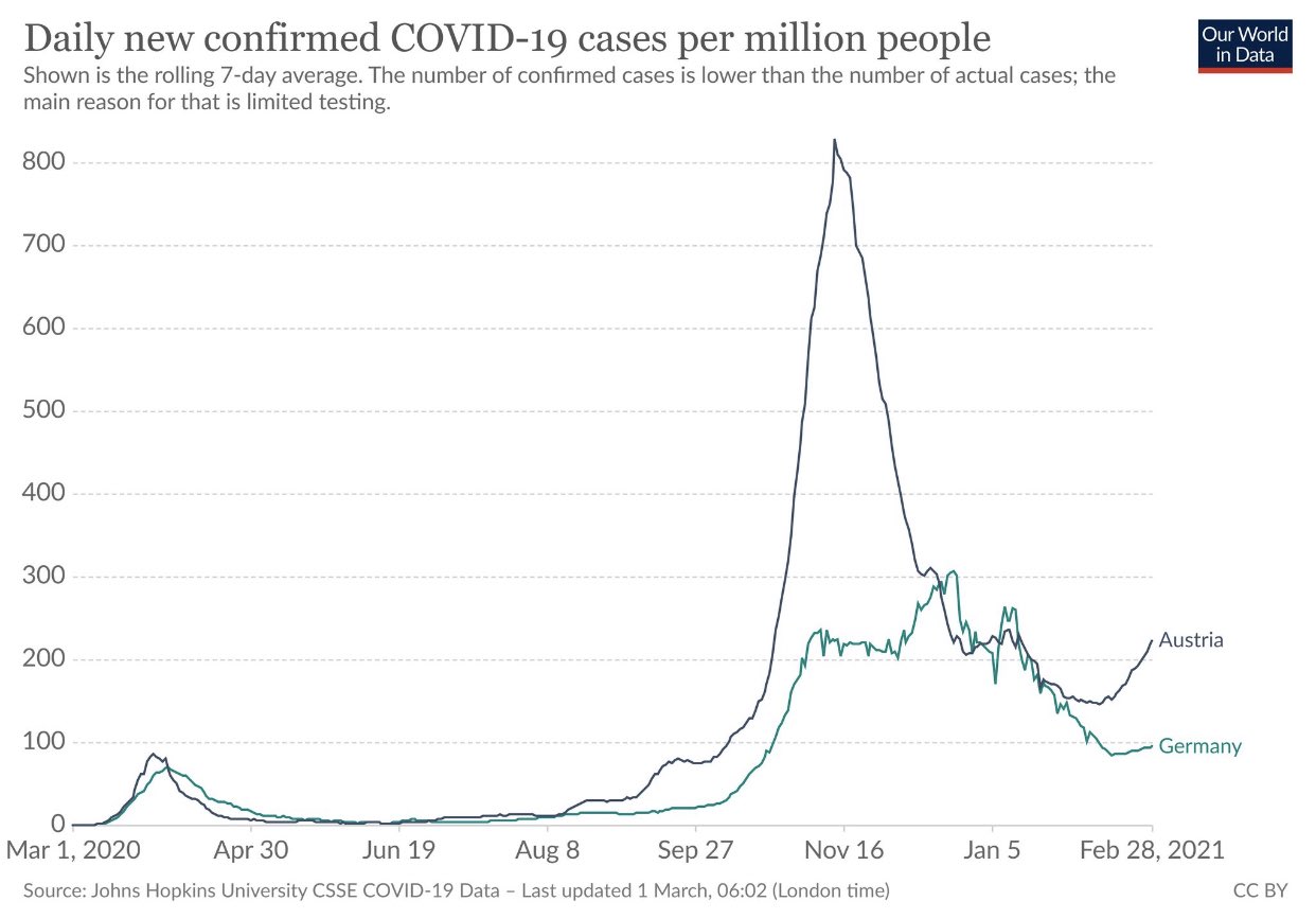 "Österreich lockert in die B117 Welle hinein. Das werden dort viele mit dem Leben bezahlen, wenn man es ehrlich beschreiben darf. Zum Schluss wird dann wieder ein Lockdown kommen, für den sich die Verstorbenen nichts kaufen können... Kein Beispiel für uns" twittert Karl Lauterbach. Und er hat hoffentlich nicht, vermutlich aber leider doch Recht.