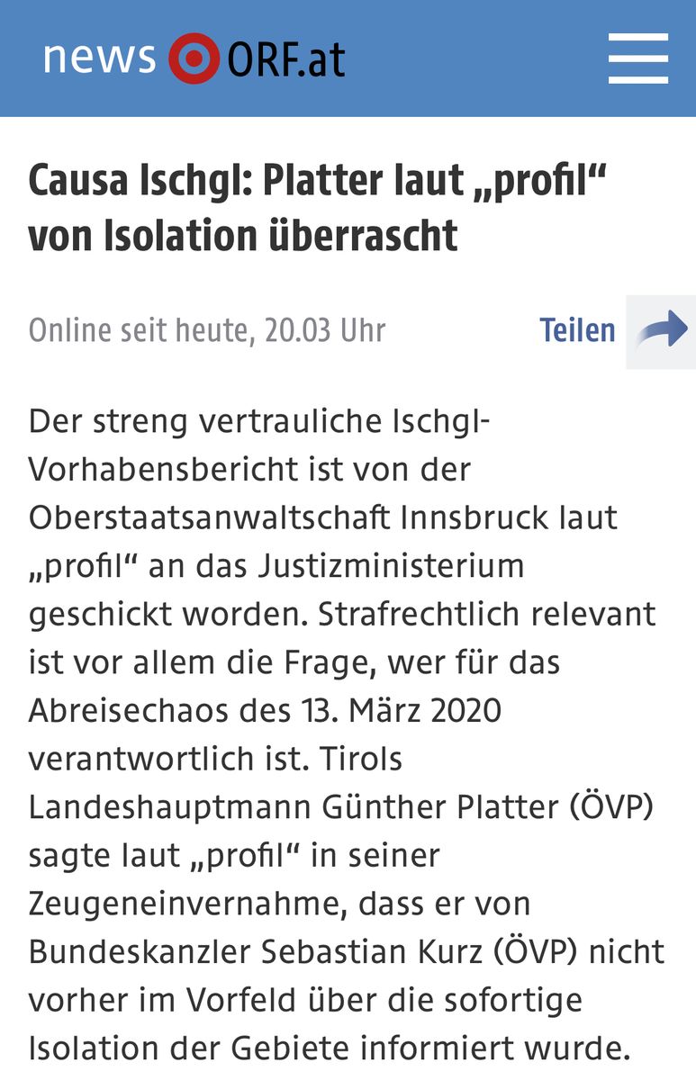 Darüber berichtet das PROFI (https://profil.at/oesterreich/la…schgl/401461780). Insbesondere über die Vernehmung des Landeshauptmanns Platter als unter Wahrheitspflicht stehenden Zeugen: Und der hat ausgesagt, dass er zwar vor der Pressekonferenz mit Kurz kommuniziert habe (Telefonat un 10:30 Uhr), dass ihm aber Kurz - und damit auch den in Tirol für die Verhängung der Quarantänen des Paznauntals und von St. Anton zuständigen Bezirkshauptmannschaften - zwar vom Beschluss über die Verhängung der Quarantänen, aber mit keinem Wort davon erzählt habe, dass sie ab der um 14 Uhr angesetzten Pressekonferenz gelten sollen, dass er als Landeshauptmann so wie die anderen Zuständigen in Tirol von der wenige Stunden danach angekündigten Quarantänen überrascht worden wären und dass daher der Bundeskanzler in hohem Maße an dem "Ausreisechaos" (mit)verantwortlich gewesen sei.