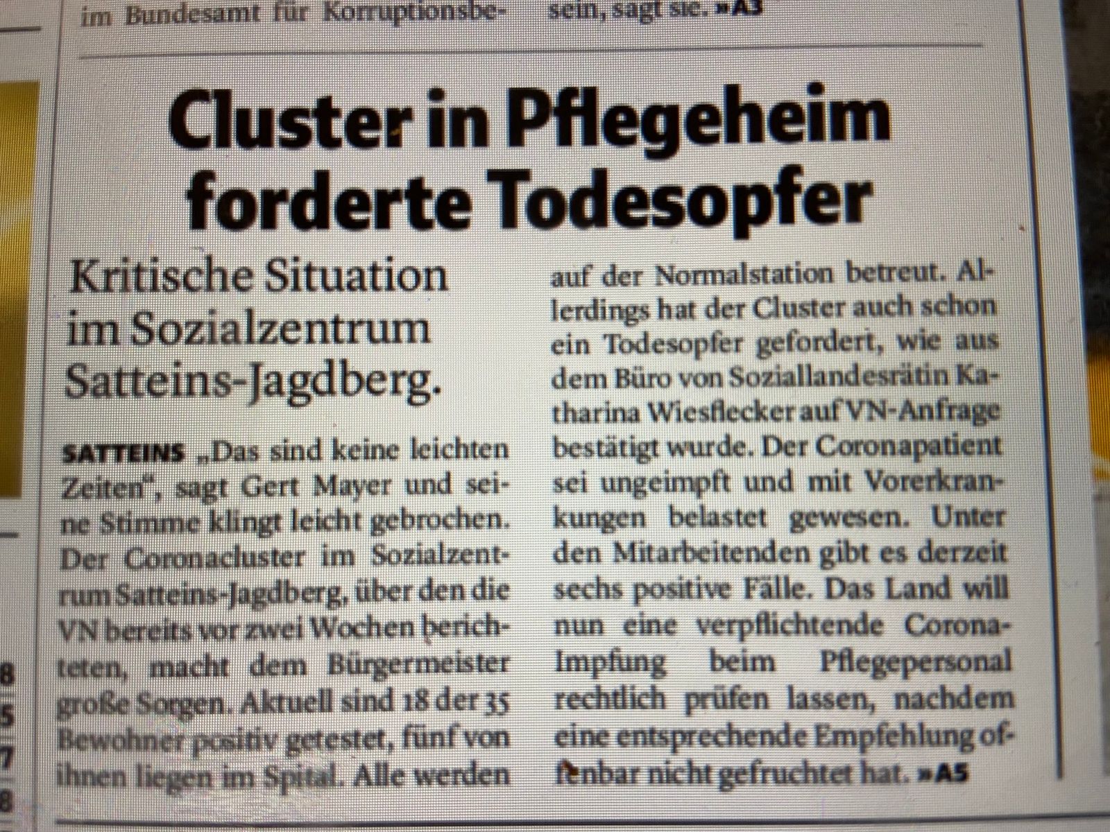 Nach einem Toten und 6 infizierten Pfleger:innen in diesem Cluster; und nach bald 2 Jahren Pandemie und nach bald 1 Jahr wirksamer Schutzimpfungen tritt das Land Vorarlberg in die rechtliche Prüfung ein, ob man Pflegepersonal zu Schutzimpfungen verpflichten könne.