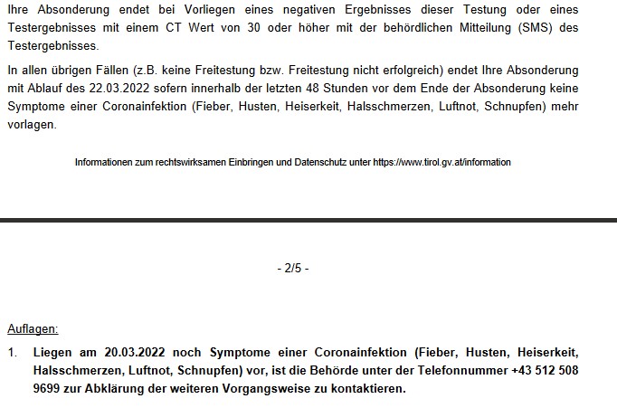 Und niemand, absolut niemand hat irgendetwas gesagt, dass man mit der Behörde reden müsste. Es kam lediglich das SMS, dass der Absonderungsbescheid aufrecht bleibt.