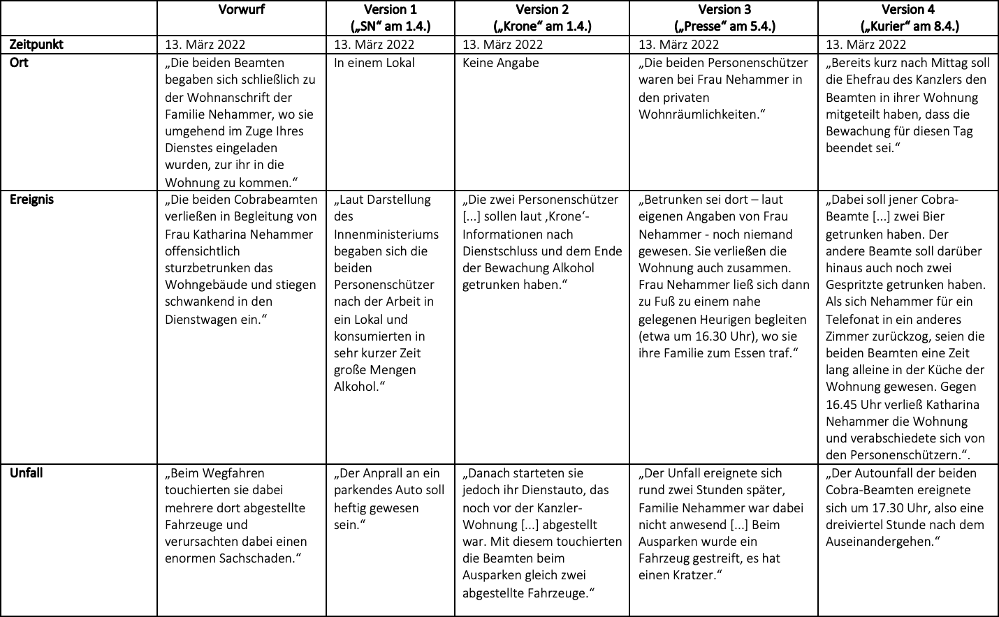 Also doch fröhliches Tschechern nicht bei einem Heurigen - so die innenministeriellen Presseaussendunden bisher -, sondern mit der Kathi Nehammer im Gemeindebau bereits ab "kurz nach Mittag". Und auch nicht nach Dienstschluss - den kann auch eine Kanzlergattin nicht bestimmen -, weil der Dienst erst mit der Rückgabe des Dienstfahrzeuges endet.