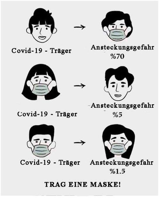 Jeder von uns stellt als potentieller Virusträger, der von seiner Infektion ja gar nichts mitbekommen muss, für andere eine Gefahr dar. Deshalb wäre es sachlich gerechtfertigt, von uns allen zu verlangen, dass wir an den "hot spots" zur Minimierung des Infektionsrisikos für andere eine FFP-2-Maske tragen (siehe Grafik oben: Wenn nur der nichtinfizierte Empfänger Maske trägt, Herabsetzung seines Infektionsrisikos um 30 %, wenn Infizierter und Nichtinfizierter Masken tragen: Herabsetzung seines Infektionsrisikos um 98,5 %!). Und sie nicht betreten dürfen, wenn wir keine solche Maske tragen. So wie der alkoholisierte Autofahrer, der öffentliche Verkehrsflächen meiden muss, wenn er 0,5 oder mehr Promille intus hat.