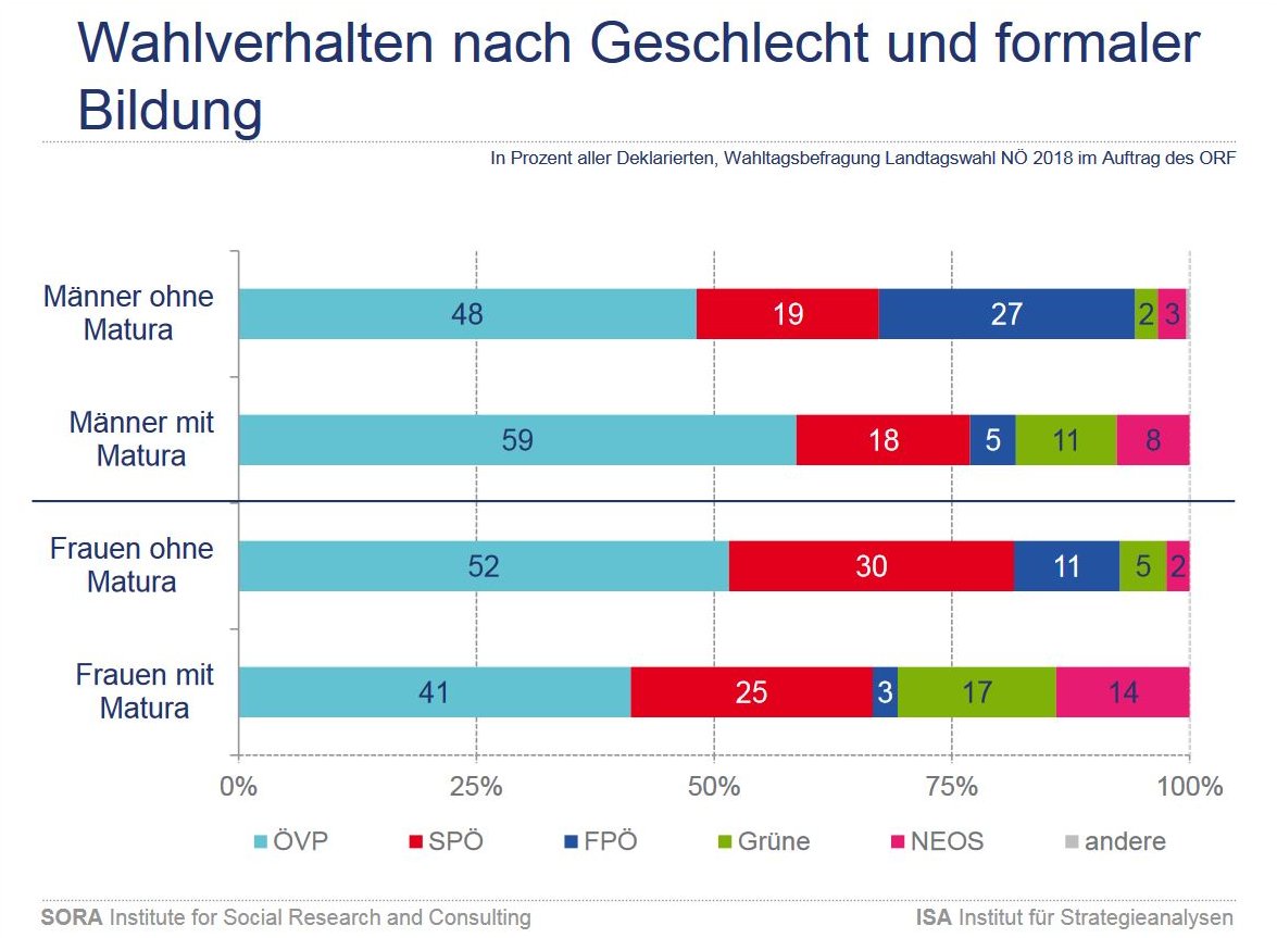 Jetzt kann man aber auch darüber philosophieren warum so viele Männer mit höherer formaler Bildung die gnadenlos durch alle denkbaren Korruptionssümpfe watende ÖVP nach wie vor brav wählen. Die ÖVP ist halt die Partei des wohlhabenden, gebildeten Mannes, der mit Korruption und Hetze gegen Migranten genau so wenig Probleme hat wie der männliche FPÖ-Wähler ohne Matura.