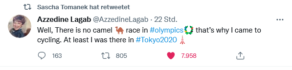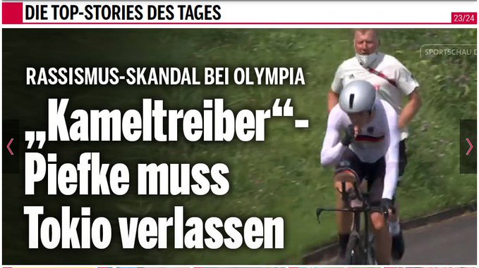 Irgendwie haben manche den Sinn von Olympia nicht verstanden! Die einen treten nicht gegen Israelis an, der deutsche Radtrainer feuert seinen Sportler an "Hol die Kameltreiber" weil ein Algerier und ein Eritreer vor ihm fahren. Zum schämen manche Zeitgenossen.