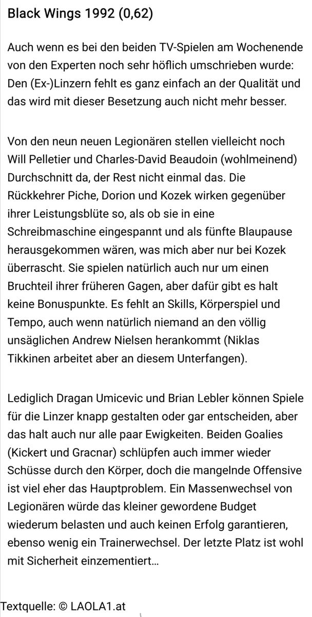 Lediglich Dragan Umicevic und Brian Lebler können Spiele für die Linzer knapp gestalten oder gar entscheiden, aber das halt auch nur alle paar Ewigkeiten. Beiden Goalies (Kickert und Gracnar) schlüpfen auch immer wieder Schüsse durch den Körper, doch die mangelnde Offensive ist viel eher das Hauptproblem. Ein Massenwechsel von Legionären würde das kleiner gewordene Budget wiederum belasten und auch keinen Erfolg garantieren, ebenso wenig ein Trainerwechsel. Der letzte Platz ist wohl mit Sicherheit einzementiert…"