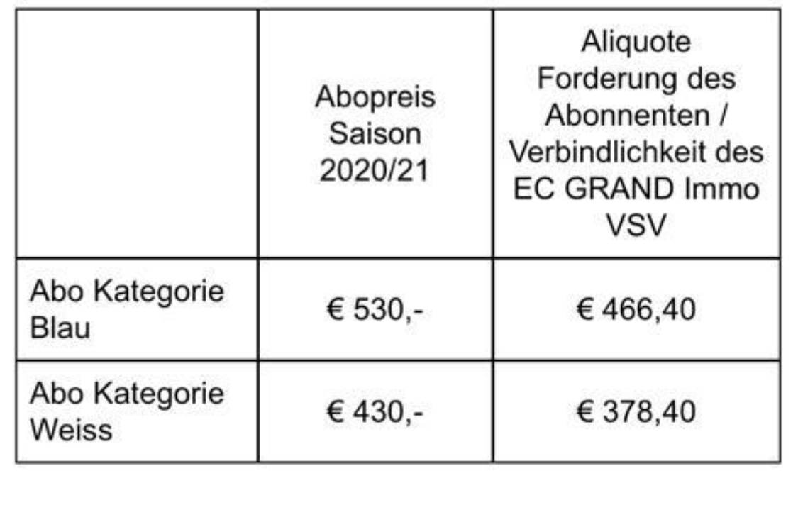 Nachfolgend finden Sie eine Auflistung der Abopreise 2020/21 mit der jeweiligen aliquoten Forderung des Abonnenten / Verbindlichkeit des EC GRAND Immo VSV: