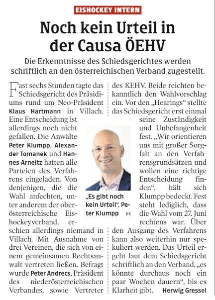 "Das vom neuen Präsidium um Klaus Hartmann nominierte Schiedsgericht tagt am heutigen Donnerstag in Villach, um über die Wahlanfechtung zu entscheiden. Der Termin wurde bewusst früh angesetzt, da das bisherige Schiedsgericht der alten Verbandsführung erst am 14. August tagt.
