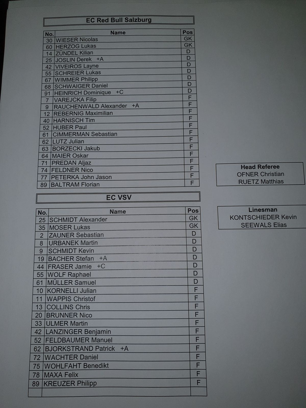 Angriff: #5 Raffl, #7 Varejcka, #9 Rauchenwald, #19 Schofield, #21 Pilloni, #26 Hochkofler, #52 Paul Huber, #72 Hughes, #74 Feldner, #77 Peterka, #89 Baltram, #96 Mario Huber