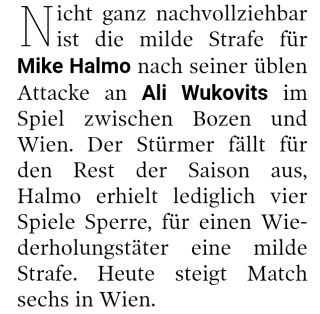 Ich tue mir extrem schwer damit, dass sich das DOPS mehr oder weniger ausschließlich hinter dem Regelbuch versteckt und es total auslässt, „erzieherisch“ auf die Spieler einzuwirken. Halmo ist ein guter Körper-Spieler, der diese Überlegenheit in der Liga schamlos ausnützt, die paar Spiele Sperre pro Saison sind dem egal und seitens Trainer, Verein scheint es auch keine Ansagen zu geben. Was machst mit so einem,- warten bis er wieder einen umfährt und dann weitere 2 Spiele plus Geldstrafe aufbrummen, oder mal aus dem Fenster lehnen und für den Rest der Saison zusehen lassen? Das wäre für mich das Signal „Player Safety“. Aber nicht 4 Spiele nachdem der Herr x- Leute über die Saison gesehen schwer verletzt hat. BTW, bin ich der Meinung, dass die jetzige Sperre isoliert betrachtet für das Vergehen zu hoch ausfällt.