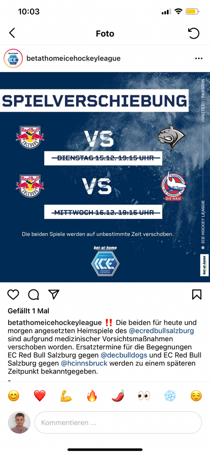 Entscheidung der Liga heute Vormittag! Kann mir aber nicht vorstellen das gespielt wird da anscheinend weitere Covidfälle bei Salzburg! Auch das morgige Spiel gegen Innsbruck wird eher nicht steigen!