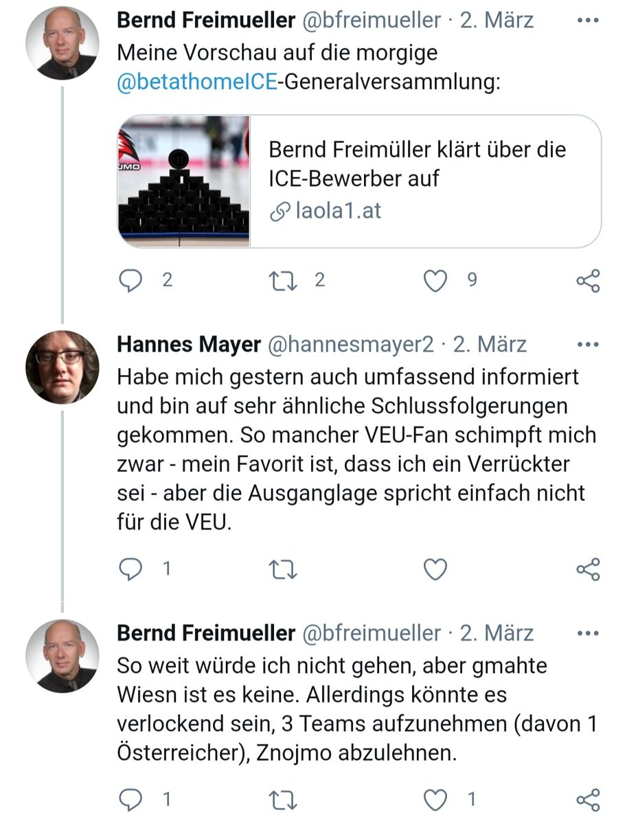 Also der größte Bonus der VEU ist für mich die Bewerbung von vor 2 Jahren und die Tatsache, dass man ein österreichisches Team wäre. Auch wenn das alles nicht so heiß gegessen, wie es gekocht wird und niemand den Extremfall heraufbeschwören möchte, aber das wären die Möglichkeiten, die auf dem Tisch liegen könnten, sollten es die Parteien auf die Spitze treiben.