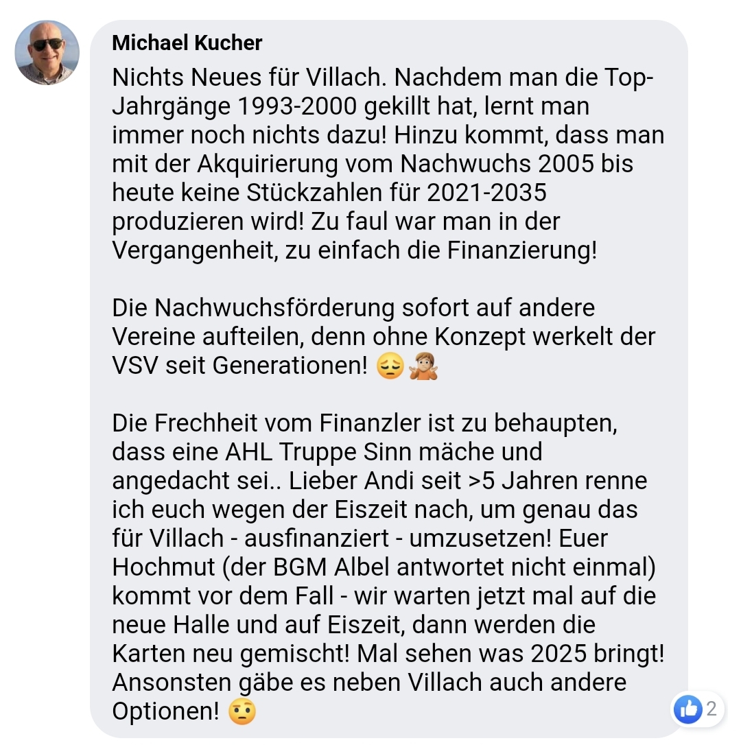 Er behauptet ja, daß er seit 5 Jahren ein "ausfinanziertes" Nachwuchskonzept hätte und vom VSV und Stadt ignoriert wird.