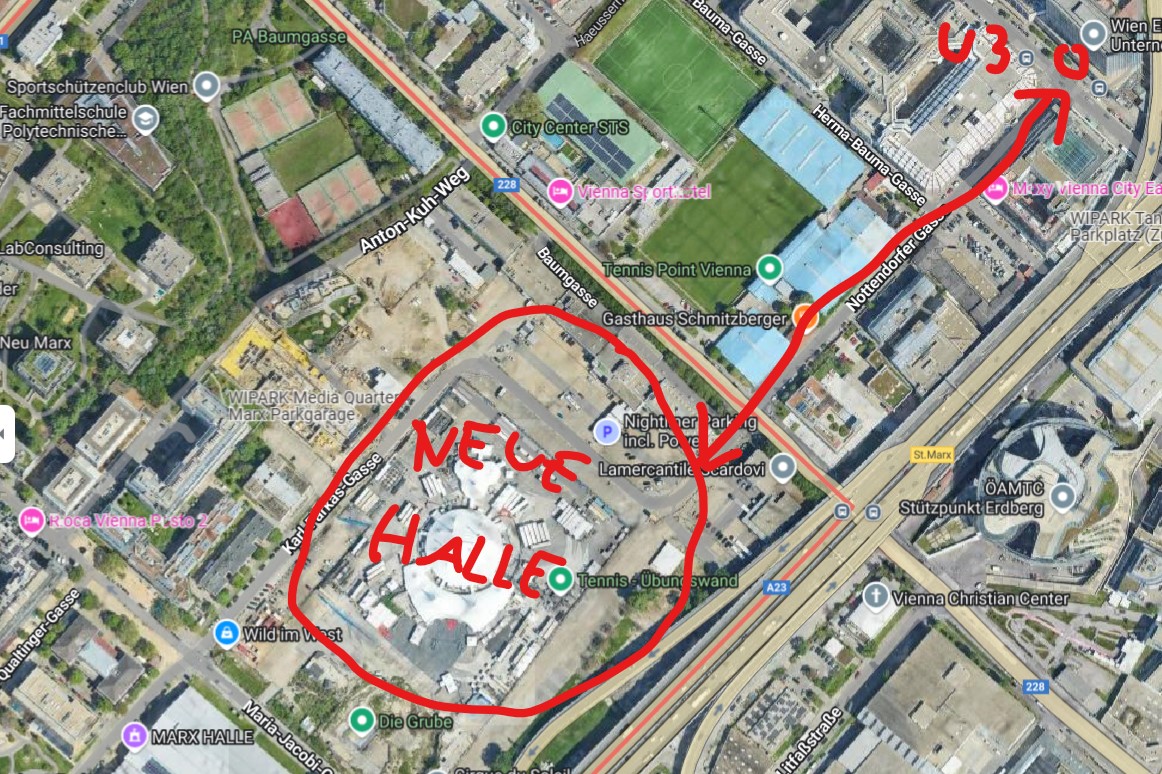 Ich arbeite ja seit Jahren in Sankt Marx gleich neben der Marx-Halle und kenn die Gegend dementsprechend sehr gut. Vom Standort der geplanten Halle ist es zur U3-Station Erdberg mit 350 Metern kürzer als man denkt und sogar um einiges kürzer als zur S-Bahn, die etwa 600 Meter weg ist. Die Nottendorfer-Gasse, die von dem Hallengelände direkt zur U-Bahn-Station führt, wird auch auf schnellen Abtransport von Leuten umgebaut, das ist Teil des Konzepts. 350-400 Meter ist eigentlich sogar sehr nahe im Vergleich zu ähnlichen Sportstätten in Europa, ich versteh aber, dass die Station gefühlt weit weg ist - weil das dort heute noch a ziemliche Gstetten ist. Wenn das einmal erschlossen und fertig ist, kommst aus der Halle raus und siehst am Ende der Gasse direkt schon die Station.