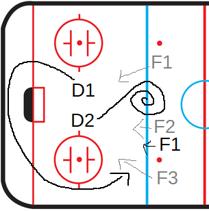 Der andere Verteidiger (D2) fährt Vollgas auf den Scheibenführer F1 zu, verfehlt ihn und dreht dann Pirouetten an der blauen Linie. (Ob er dazu vertraglich verpflichtet ist oder das einfach eine Zugabe ist, müsste ein Vereins-Insider klären.)