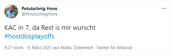 Wenn ich das richtig sehe, müssen wir den KAC also sweepen. Weil bei den letzten drei Spielen würde uns die Luft ausgehen. Ist von mir aus auch okay, ich muß den KAC ohnehin nicht so oft sehen.