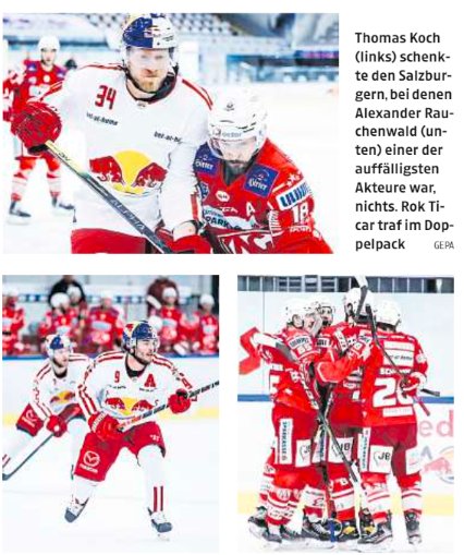 Ein fast ver­lo­ren ge­glaub­tes Spiel konn­te der KAC in der Ver­län­ge­rung mit 3:2 noch für sich ent­schei­den. Zu den Match­win­nern avan­cier­ten Rok Ticar mit zwei Tref­fern und Cle­mens Un­ter­we­ger.