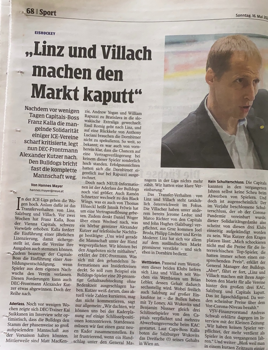 Laut Neue wechselt auch Fröwis, wahrscheinlich ins Ausland. Kutzer zeigt sich, um es nett auszudrücken, nicht gerade erfreut über die Transferpolitik Villach und Linz.