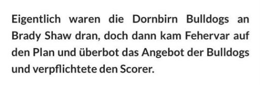 HN mit ihren Insiderinfos wieder mal daneben gelegen bei Brady Shaw. Im Gegensatz zu Ring Sports, welche den Transfer zu Dornbirn dementiert haben 🤔