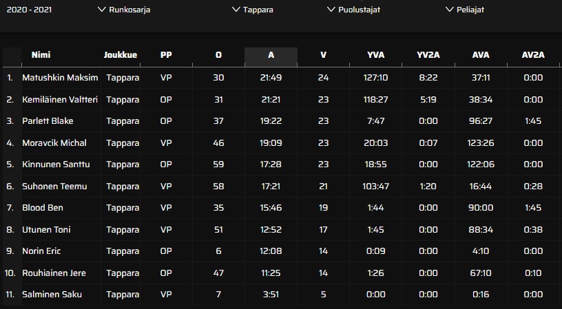 Das geht sich nicht aus. Hab es übrigens auf der Liiga-Webseite nachgeschaut: im Grunddurchgang waren es 17:21 Minuten pro Spiel (#6 unter den Tappara-Verteidigern), in den Playoffs 15:51 Minuten pro Spiel (#7). Und wenn da tatsächlich Powerplay-Eiszeit dabei ist (was angesichts seiner Punkteausbeute durchaus glaubwürdig klingt: 17 Assists = zweitbester Wert der Verteidiger im Team), dann bleibt unter dem Strich ein Verteidiger, der bei Equal Strength nur Nummer 7 in der Hackordnung war und dafür ein bisschen ein PP-Spezialist ist.