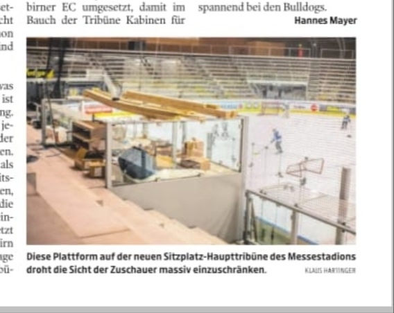 Ein paar Seiten vorher ist ein Bericht über den Tribünenbau. Da hat die Stadt eine Plattform mitten in der Tribüne bauen lassen und das behindert die Sicht auf die Eisfläche lt Neuen enorm. Das Foto davon schockt mich. Wie kann man sowas bauen????? Sind die wo angerannt???