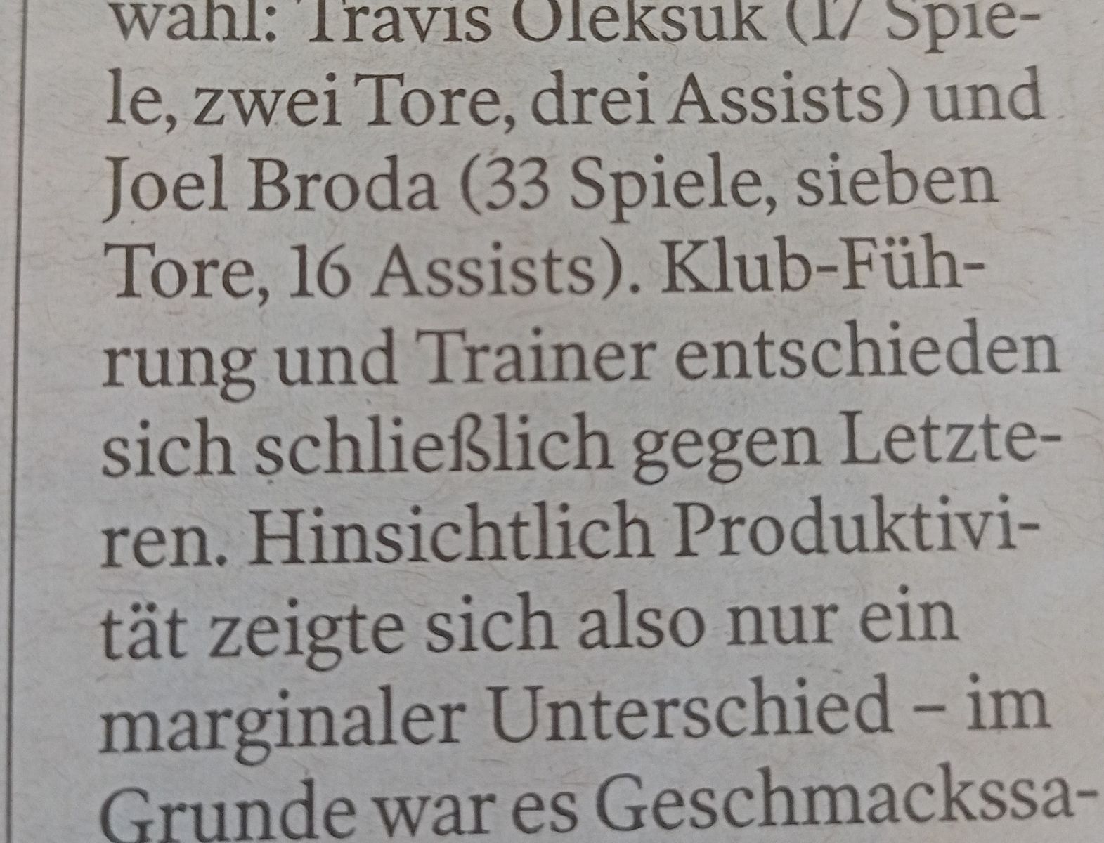 vor allem sollte man erwähnen das Broda nominell als 3.Linien Center verpflichtet wurde und auf 23 Punkte aus 33 Spielen kommt (wenn ich das jetzt richtig im Kopf habe)