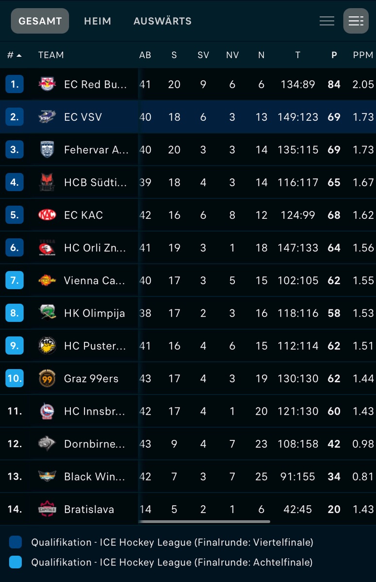 Na ja, so ganz uninteresssant ist es nicht. Hätten wir 2 x gewonnen statt verloren, wären wir sogar noch im Rennen um Platz 1, während die rote Brut hauchdünn vor Graz auf Platz 10 um die PO Quali zittern müsste.