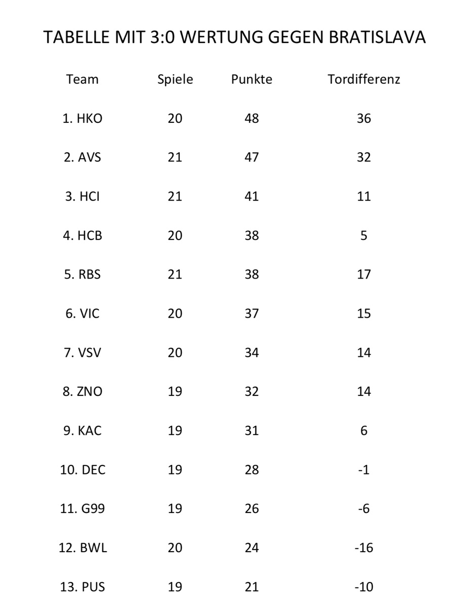 Ich denke nicht dass wir in diesem international Break vor dem KAC bleiben werden. Ich glaube dass mit einer möglichen Ausstiegsaktion von Bratislava deren Niederlage in 3P umgemünzt werden würde und der KAC somit vor uns wäre.