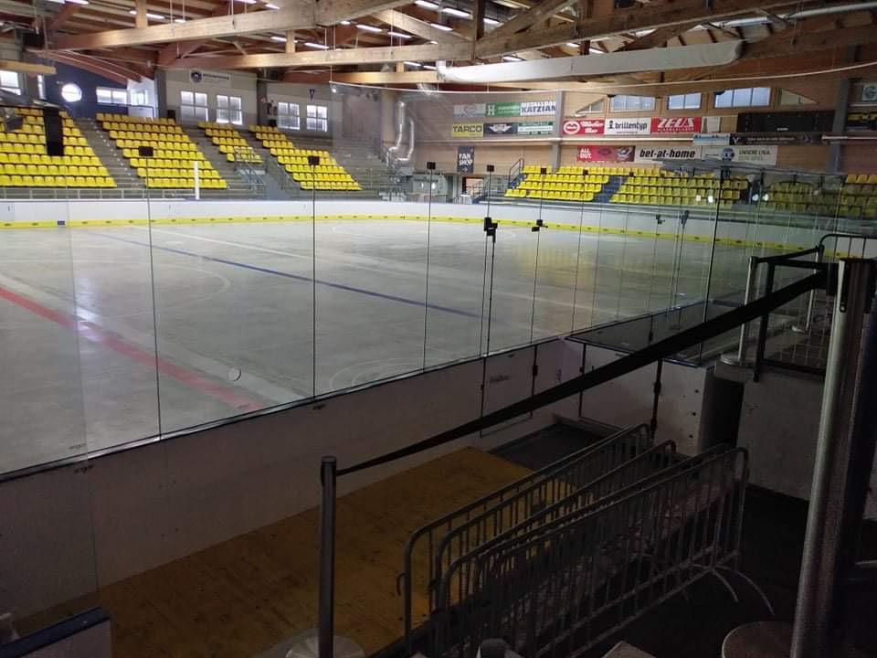 Die neue Bande in der Eishalle ist echt toll geworden. Von der Sicherheit gegenüber der alten ein Quantensprung. Unter dem Plexiglas gibt es einen schmalen abgerundeten Handlauf aus Gummi und die Bande ist ca. alle 3m offen und wird von einem Zug bzw. Feder System zusammengehalten. Die Verkleinerung der Eisfläche ist deutlich zu erkennen und wird sich positiv auf die Geschwindigkeit im Spiel auswirken. 😎