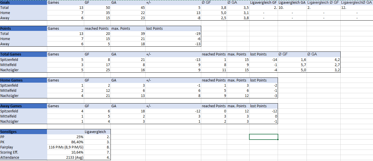Hallo in die Runde, nachdem ich bei der Laibach Partie zuletzt, aufgrund der enormen Spannung, angefangen habe ein VSV-Liga Excel zu führen, will ich euch einige Auswertungen nach dem ersten Viertel des GD nicht vorenthalten. Ich werde keine Daten interpretieren, dass soll jeder für sich machen, falls jemand noch irgendwas haben will dann kann er sich gerne melden und ich schau ob ichs umsetzen kann.