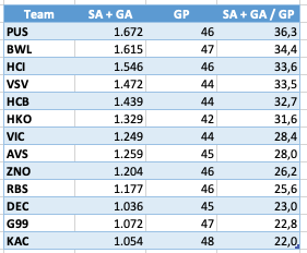Ich habe mir aus Interesse einmal die SA+GA der Summe aller Goalies je Verein per GP angesehen, um vielleicht einen Einblick zu bekommen, wie unsere DEF im Vergleich zu den anderen Vereinen der Liga performt: