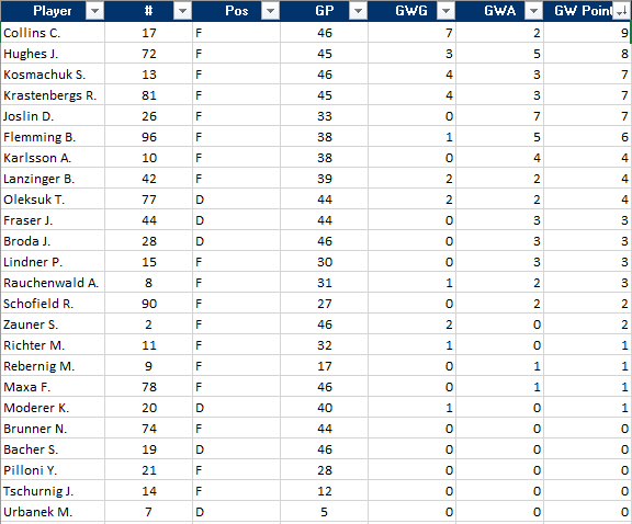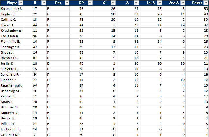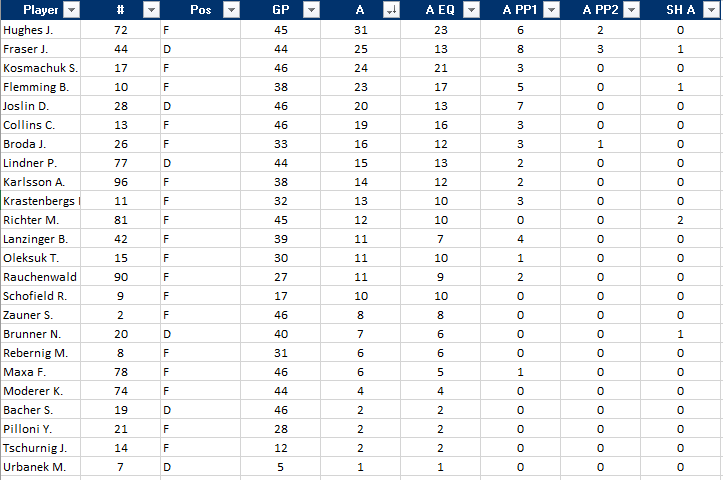 Wirklich überraschendes jetzt nicht wirklich dabei, außer vielleicht das bie Fraser überproportional im Vergleich zu anderen die Punkt eim Powerplay gemacht wurden und auf viele 2nd Assists. Aber habe keinen Vergleich wie das zB in der NHL bei den Verteidigern ist.
