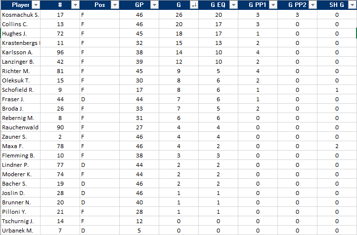Wirklich überraschendes jetzt nicht wirklich dabei, außer vielleicht das bie Fraser überproportional im Vergleich zu anderen die Punkt eim Powerplay gemacht wurden und auf viele 2nd Assists. Aber habe keinen Vergleich wie das zB in der NHL bei den Verteidigern ist.
