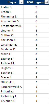 5. GWG against (sprich wer, war wie oft auf der Platte als der Gegner das GWG geschossen hat) (Das ist leider etwas schwer zum Auswerten, aber versucht hab ichs mal)