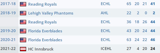 Seit der langen Pause kann er kaum mehr Assits (die 2. Spalte) zu Toren geben und steht öfter bei Gegentoren am Eis als vorher.