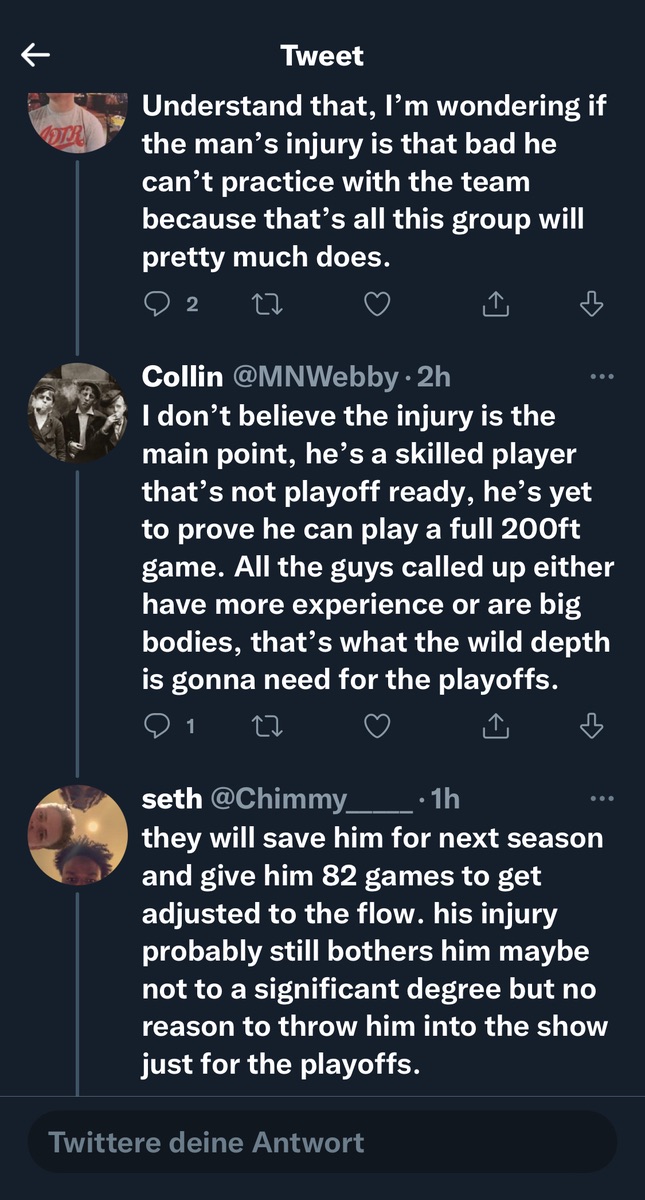 Mal schaun wie die Serie ausgeht. Solltens verlieren, würd ich mal behaupten, es mangelt den Leistungsträgern an Playoff Erfahrung...aber jetzt warten wir mal ab, ich hätte die Wild schon weiter oben gesehen.