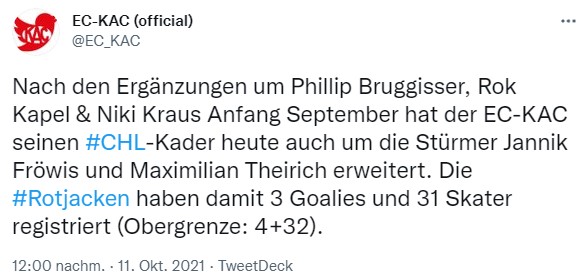 Im Rückspiel zum letzten CHL Vorrundenspiel des EC KAC am kommenden Mittwoch soll eine stark verjüngte Kampfmannschaft auflaufen.