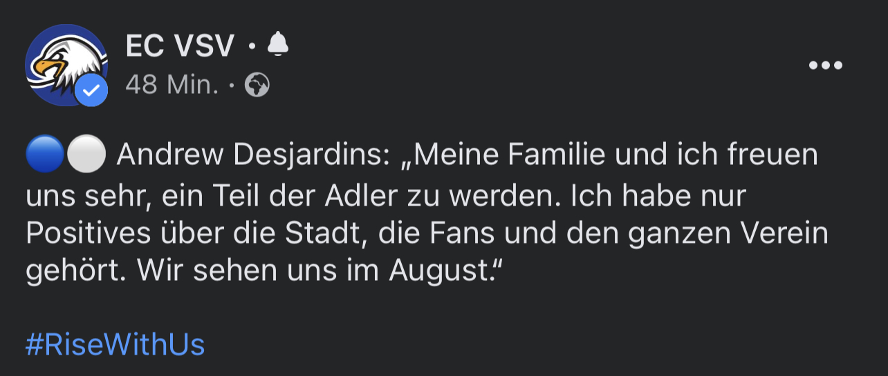 Desjardins war in der NHL ein Role Player, er spielt hart und haut sich mit allem rein was er hat. Seine Einstellung ist ein Wahnsinn und wenn es einen Spieler gibt, der die "VSV-Tugenden" vertritt, dann ist es sicher ein Desjardins. Ich glaube der wird in Villach ein Publikumsliebling. Trotzdem fehlt uns noch ein Sniper und ich hoffe der kommt noch.
