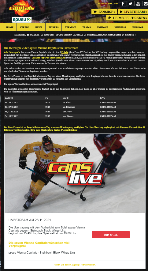 Bei anderen Teams kann man mit seinem ICE-Account direkt auf der ICE-Seite streamen, beim Caps Spiel wird man von der ICE-Seite auf die Caps-Seite verlinkt.