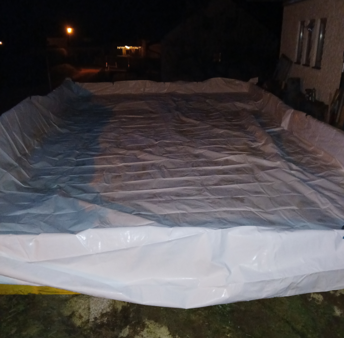 Sandsäcke - da es nicht 100% eben ist werden die Röhre wo zuviel Luft ist mit Sandsäcken unterlegt damit das Wasser die Folie nicht rausdrückt drunter