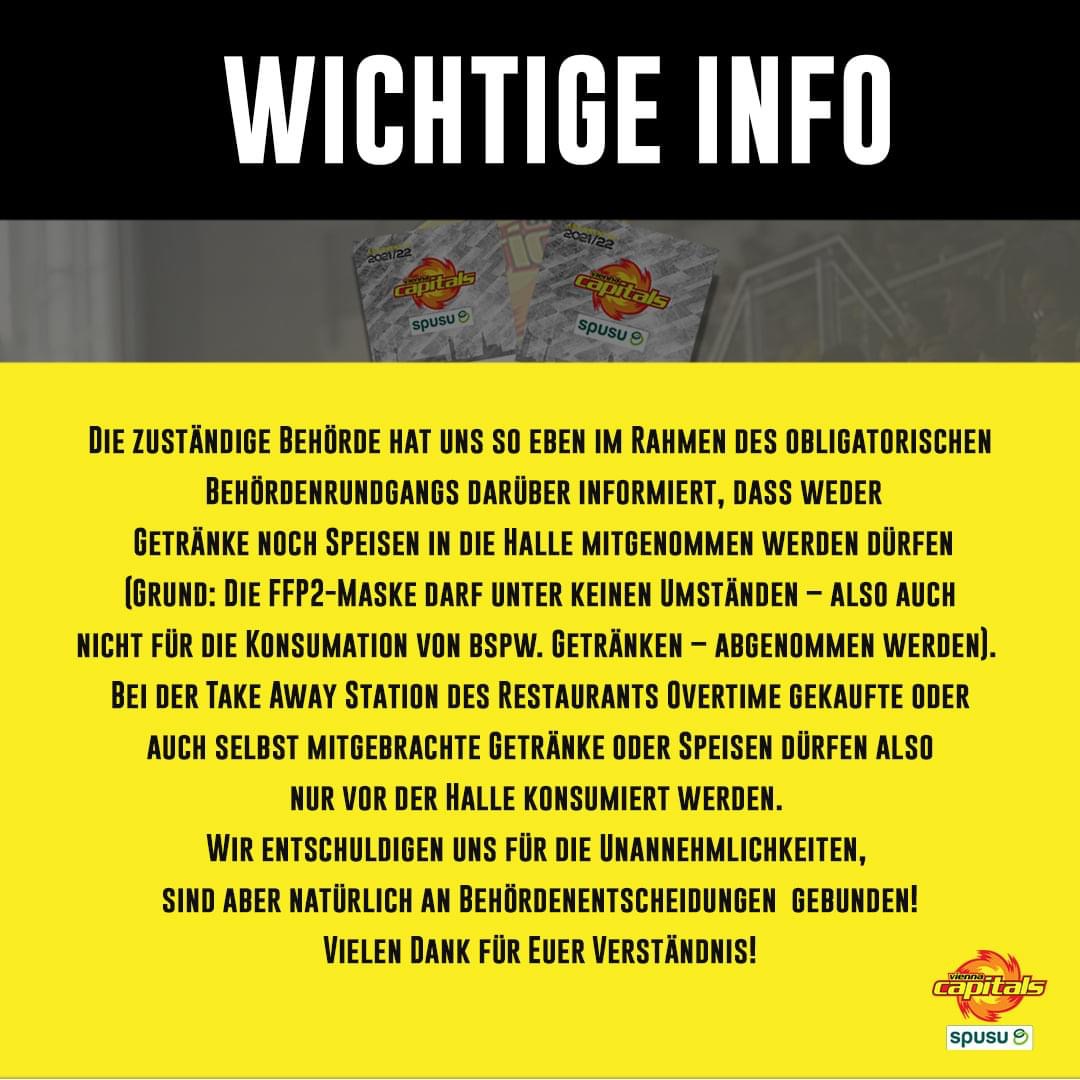 Gemäß der Verordnung der Stadt Wien sind den Caps bei den Heimspielen am 17. und 19.12.2021 keine Angebote zur Verpflegung (Verkauf von Essen & Getränken) gestattet, die „Gastronomieöffnung“ in Wien findet erst am 20.12.2021 statt – somit darf ein Verkauf erst wieder ab dem Heimspiel am 28.12.2021 erfolgen. In der STEFFL Arena gibt es dadurch bei den kommenden Heimspielen keine Konsumationsmöglichkeiten. Eigene geöffnete Getränke bzw. Snacks können selbstverständlich zum Heimspiel-Besuch mitgenommen werden. Es müssen allerdings die Sicherheitsbestimmungen in der STEFFL Arena eingehalten werden. Das heißt konkret: Es dürfen keine Getränke in Glasbehältnissen in die STEFFL Arena mitgenommen werden. Weiters muss bei PET-Flaschen beim Eingang der PET-Verschluss heruntergenommen werden bzw. im Falle von Dosengetränken die Dose geöffnet werden.